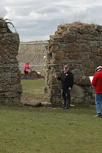 The 16th-century ruins of the tower house and enclosure walls are all that remains. The original 15th-century tower house was extended in the 16th century to form a larger residence.[1] The basement of the tower is vaulted.[2] The tower stands at the north-east corner of the square walled garden area, 68 metres (223 ft), enclosed by walls 85 centimetres (33 in) thick, probably constructed after 1690. The house was demolished after 1760, and the walls survive intact on the northern sides.[1] The tower, house and walls are protected as a scheduled monument.[3]