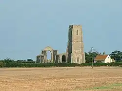 In the Middle Ages Covehithe prospered as a small town and during the reign of Edward I was granted a fair on the feast day of St Andrew. It takes its modern name from the de Cove family who held land there at that time, and the fact that it had a hithe, or quay, for loading and unloading small vessels.[6] By the 17th century however it had fallen victim, like nearby Dunwich, to coastal erosion. The large church of St Andrew, which had been built on the back of its wealth, was largely pulled down, although its tall tower remains, and a smaller thatched church was erected amongst the ruins in 1672.[7] There is archaeological evidence of the linen industry having been carried out at Covehithe until the 18th century.[3]