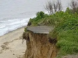 The coastal cliffs at Covehithe are formed of glacial sands and other deposits. Loose and unconsolidated, they erode rapidly, currently at around 4.5 metres a year,[15] although Environment Agency studies found that 75 metres (250 ft) had been lost between 1992 and 2006 at a rate of 5.3 metres (17 ft) a year.[16] The main part of the settlement at Covehithe, around 250 metres from the current shoreline, is expected to be lost to erosion by 2110, possibly even by 2040.[15][17][18] Any future attempts to protect Covehithe are thought to be unsustainable, and would likely increase erosion rates at the larger settlement of Southwold to the south.[15][18]