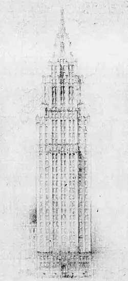 In 1914, Reformed Presbyterian merged with First Presbyterian, who also absorbed West Liberty Presbyterian in 1928.[2] In 1929, First Presbyterian's 1851 church was valued at $1.3 million ($23.8 million in 2024). In August of that year, First Presbyterian announced plans to replace their church with a 40-story, 470-foot skyscraper, named Temple Tower. The project was announced on the same day as the Carew Tower. First Presbyterian hired the Midland Building Company for construction, who in turn hired local architectural firm Hannaford & Sons to design the building. Their design fused elements of Art Deco and Gothic architecture. Temple Tower was planned to be a mixed-use building, with stores on the first two floors, office space until the 32nd floor, and a new church on four floors in the rear of the building. An eight-floor "cathedral-like" spire would top the building after the 32nd office story, featuring the same golden hand from the previous church. The tower was projected to cost $2,225,000 ($40.7 million in 2024). The Great Depression began two months after the announcement of the project, and it was never built. Had it been built, Temple Tower would have been the third-tallest building in the city at the time, behind only the Carew Tower and the Fourth and Vine Tower.[3]