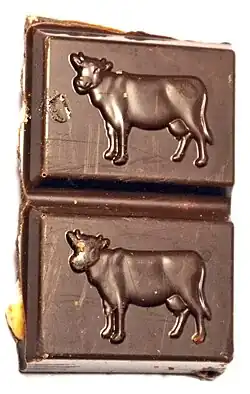 Cow brand chocolate was first produced in 1934[2] under the name "Shamnunit" (Hebrew: שמנונית, lit.'creamy'). Since the 1950s, the wrapping of the chocolate bar has featured the illustration of a cow, giving the product its name.[3]