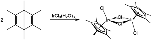 A now-obsolete route to Cp* complexes involves the use of hexamethyl Dewar benzene. This method was traditionally used for preparation of the chloro-bridged dimers [Cp*IrCl2]2 and [Cp*RhCl2]2, but has been discontinued with the increased commercial availability of Cp*H. Such syntheses rely on a hydrohalic acid induced rearrangement of hexamethyl Dewar benzene[9][10] to a substituted pentamethylcyclopentadiene prior to reaction with the hydrate of either iridium(III) chloride[11] or rhodium(III) chloride.[12]