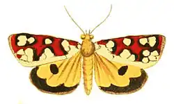 Upperside: head brown. Antennae filiform. Thorax and abdomen yellow brown. Superior wings fine darkish red, with several yellow spots thereon of different shapes, each encircled with black; the posterior and external edges having yellow margins. Posterior wings deep yellow, inclining to orange, with a black oval spot near the middle of each. Along the external edges is a black margin, reaching from the upper to the abdominal corners; the upper edge being scalloped.