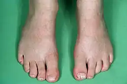 Craniofrontonasal dysplasia (craniofrontonasal syndrome, craniofrontonasal dysostosis, CFND) is a very rare X-linked malformation syndrome caused by mutations in the ephrin-B1 gene (EFNB1).[1][2] Phenotypic expression varies greatly amongst affected individuals, where females are more commonly and generally more severely affected than males.[1][2] Common physical malformations are: craniosynostosis of the coronal suture(s), orbital hypertelorism, bifid nasal tip, dry frizzy curled hair, longitudinal ridging and/or splitting of the nails, and facial asymmetry.[3][4][5][6]