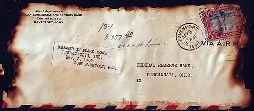 A crash cover is a philatelic term for a type of cover (including the terms air accident cover, interrupted flight cover, wreck cover), meaning an envelope or package that has been recovered from an air crash, train wreck, shipwreck or other accident. Crash covers are a type of interrupted mail.