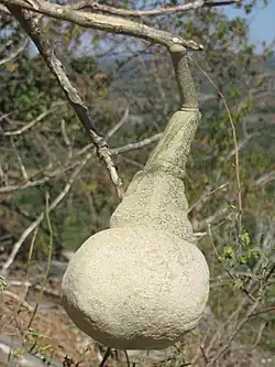The large pendulous fruits are gourd-shaped, have a leathery texture and are up to 12 cm in diameter, hang from long, thick, sharply bent, jointed stalks, and give off an odour repulsive to humans on being picked.