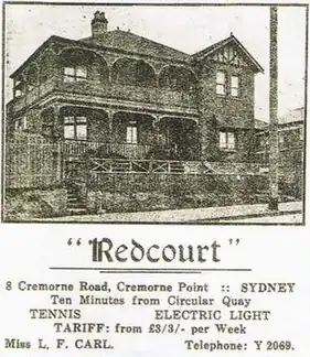 - ^ "REDCOURT, Cremorne Rd, Cremorne". The Historian. 37 (1). Ku-ring-gai Historical Society: 120. Archived from the original on 9 April 2013. Retrieved 12 August 2012.
