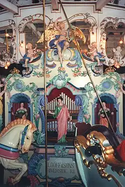An Andreas Ruth und Sohn Style 38(or 38er Ruth) band organ, imported from Waldkirch, Germany, provides music from a Wurlitzer 165 music roll system, which replaced the original Ruth 96-keyless cardboard book music system.[8] At least six cassette volumes of recorded music were previously sold at the carousel and have become rare collector's items. In response to noise complaints by the carousel operators and visitors, several of the ranks of pipes in the band organ have been disabled to reduce the music volume. In a notable 1995 incident, carved instruments from the facade of the band organ were stolen.[9]
