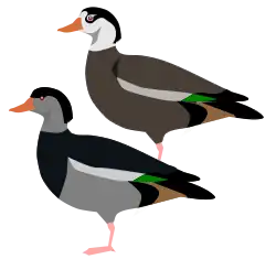 The crested shelduck is sexually dimorphic, with the male possessing a greenish-black crown, breast, primaries, and tail, while the rest of its face, chin, and throat are brownish black.[13][14] The male's belly, undertail coverts, and flanks are a dark grey with black striations. The upper wing coverlets are white, while its speculum is an iridescent green. The female has a large white eye ring, black crest, and white face, chin, throat, neck, and upper wing coverts. It also has a dark brown body with white striations.[13][14] Both sexes have a green tuft of feathers protruding from their head.[14] The crested shelduck is about 63 to 71 centimetres (25 to 28 in) long, and therefore is slightly larger than a mallard.[13] Its bill and legs are pinkish, though those of the female are paler than those of the male.[10] The bill of the male has a small, knob-like appendage at its base.[5] The plumage of the immature is unknown.[13]