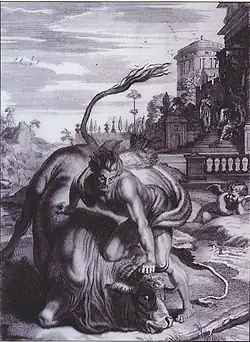 Heracles was sent to capture the bull by Eurystheus as his seventh task. He sailed to Crete, whereupon Minos gave Heracles permission to take the bull away[3] as he had been wreaking havoc on Crete by uprooting crops and leveling orchard walls. Heracles captured the bull, and then shipped him to Eurystheus in Tiryns. The bull later broke loose and wandered into Marathon, becoming known as the "Marathonian Bull".[3] Eurystheus then sent Heracles to bring back the man-eating Mares of Diomedes (the next task).