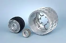 An example of an in-house NASA design for rover is the wheeled version of the Space Exploration Vehicle, which has a version for outer space.[9][10] An early version of the SEV rover was tested in 2008 by NASA in the desert.[10] The SEV for space or roving missions was designed to support two humans for 14-days, and would include a toilet, sleeping logistics, and one version has suitports to support EVAs.[10][11] Another concept is a windows that allow looking at objects very close to the front of the rover but on surface (down and to the front).[10]