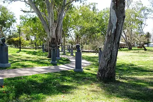 The Cricket Captains' Walk is a collection of specially commissioned bronze busts of Test captains of the Australian men’s national cricket team, arrayed on pedestals on the outside of a rectangular path set in a large public park in Cootamundra, New South Wales. The all-weather path, which starts and ends at Wallendoon Street is wheelchair friendly, and approximately 150 metres around.
