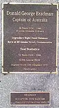 The nearby statue by Valerius[2] (shown below) of Bradman in action was unveiled during the celebrations for "Sir Don"'s 92nd Birthday in August 2000.[3] A minor mystery surrounds the Brian Booth sculpture, similar in style to others by Valerius, but not credited in the official documentation. There is no obvious clue in the plaques, which have remained uniform in style and execution over 30 years.