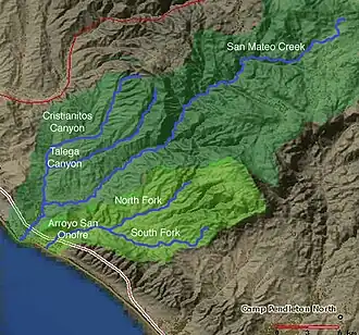 ![]() Map of San Mateo Creek and Arroyo San Onofre drainage basins. San Mateo Creek basin is in dark green. | |