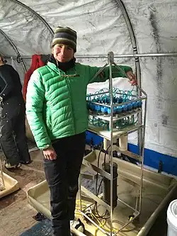 Takacs-Vesbach's contributions to Antarctic science have been in the field of microbial ecology.[5] Until her doctoral research on bacterioplankton biomass and productivity in the lakes of the McMurdo Dry Valleys, Antarctica, bacterioplankton were considered unimportant. She used a forward difference model to show that not only are bacteria significant to the biomass of these lakes, but that substantial predation occurs every season to reduce bacterial biomass by up to 88% at the height of the growing season. Further work by Takacs-Vesbach in this system included estimates of bacterioplankton organic carbon demand and respiration rates. Takacs-Vesbach also contributed to the description of the first microbiological study of sub-glacial Lake Vostok. Along with her colleagues, Takacs-Vesbach reported the presence and activity of bacteria associated with the accretion ice >4 km below the surface of the Antarctic polar plateau. This provided evidence that life may exist in inhospitable settings, which opened the possibility that other planetary bodies, such as Europa or Enceladus, may harbor life today.[6] It is only in the past few years that Lake Vostok and other similar subglacial lakes finally have been sampled, confirming the initial findings of Takacs-Vesbach and her colleagues that life can exist in the deep icy subsurface of Antarctica.[6][7]