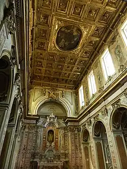 The monastery is now replaced with medical clinics of the University of Naples. The interior was decorated on designs by Francesco Antonio Picchiatti. The nave ceiling has 16th century paintings depicting the Madonna del Carmine and Saints attributed to Giovanni Battista Caracciolo. Other works made for the church include puttini a chiaroscuro over the arches of the chapels by Giovanni Battista Rossi, pupil of Solimena. The first chapel on the left, has an Annunciation attributed to either Francesco Curia or Manchelli, a pupil of Marco da Siena. The second chapel has paintings of Saints Domenico & Monica by Nicola Malinconico. The third chapel has a Santa Maria Maddalena de’ Pazzi by the studio of Vaccaro. The altar and tabernacle are attributed to a Sanfelice in 1684.[2] It has paintings by Giovanni Battista Rossi.