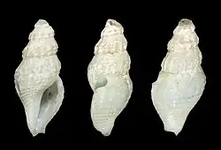 (Original description) The small, white shell has four or more whorls, exclusive of the (lost) protoconch. The suture is distinct, not appressed. The whorls slope behind and are rounded in front. The axial sculpture consists of (on the penultimate whorl about 17) short rounded ribs with subequal interspaces, hardly extended over the periphery and gradually becoming obsolete on the body whorl . Incremental lines are somewhat conspicuous on the base where they slightly reticulate the spiral sculpture. The latter comprises three prominent cords on the periphery equal and equidistant, swollen where they over ride the ribs, and feebler on the body whorl. The anal fasciole carries finer equal spiral threads, the base 10 or more somewhat larger and more nearly adjacent as they approach the siphonal canal. The aperture is rather narrow. The outer lip is solid and sharp-edged. The anal sulcus is large, rounded, close to the suture. The inner lip is erased. The siphonal canal is short, deep and slightly recurved.[2]