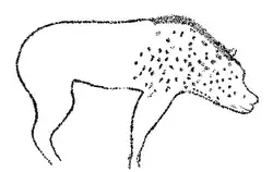 The cave hyena is depicted in a few examples of Upper Palaeolithic rock art in France. A painting from the Chauvet Cave depicts a hyena outlined and represented in profile, with two legs, with its head and front part with well distinguishable spotted coloration pattern. Because of the specimen's steeped profile, it is thought that the painting was originally meant to represent a cave bear, but was modified as a hyena. In Lascaux, a red and black rock painting of a hyena is present in the part of the cave known as the Diverticule axial, and is depicted in profile, with four limbs, showing an animal with a steep back. The body and the long neck have spots, including the flanks. An image on a cave in Ariège shows an incompletely outlined and deeply engraved figure, representing a part of an elongated neck, smoothly passing into part of the animal's forelimb on the proximal side. Its head is in profile, with a possibly re-engraved muzzle. The ear is typical of the spotted hyena, as it is rounded. An image in the Le Gabillou Cave in Dordogne shows a deeply engraved zoomorphic figure with a head in frontal view and an elongated neck with part of the forelimb in profile. It has large round eyes and short, rounded ears which are set far from each other. It has a broad, line-like mouth that evokes a smile. Though originally thought to represent a composite or zoomorphic hybrid, it is probable it is a spotted hyena based on its broad muzzle and long neck. The relative scarcity of hyena depictions in Paleolithic rock art has been theorised to be due to the animal's lower rank in the animal worship hierarchy; the cave hyena's appearance was likely unappealing to Ice Age hunters, and it was not sought after as prey. Also, it was not a serious rival like the cave lion or bear, and it lacked the impressiveness of the mammoth or woolly rhino.[7]