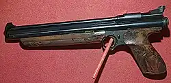 The Model 1322 is a pneumatic pump-action air pistol utilizing .22 (5.5 mm) caliber lead pellets. The pistol's integral pump lever mechanism is located underneath the barrel, integral to the forearm. This pump lever is cycled a variable number of times (up to a maximum of ten strokes) to store increasingly pressurized air in a chamber. When the trigger is activated, an air valve dumps the pressurized air into a transfer port integral to the breech, discharging the pellet from the barrel. According to the manufacturer, a maximum velocity of up to 440 ft/s (130 m/s) was achievable with ten pump strokes, using standard 14.3-grain .22 pellets.[3][4] The Model 1322 features fully adjustable square notch rear and front fixed blade sights.[5]