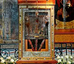 The oldest icon in the cathedral is probably the Icon of the Mother of God of the Sign, which according to legend miraculously saved Novgorod in 1169 when the Suzdalians attacked the city; it was brought out of the Church of the Transfiguration on Il'ina Street and displayed in the cathedral and on the walls of the city by Archbishop Ilya. The Church of the Icon Mother of God of the Sign was built next to the Church of the Transfiguration in the seventeenth century to house the icon. During the Soviet period, it was housed in the nearby Novgorod Museum (as were the bones of Bishop Nikita, said to have been kept in a paper bag until they were transferred to the Church of Sts. Philip and Nicholas in 1957); the icon was returned to the cathedral in the early 1990s and stands just to the right of the Golden Doors of the iconostasis. The icon of Sophia, the Holy Wisdom of God, is also quite old and is part of the iconostasis just to the right of the Golden Doors as well (where the icon of the saint to which the church is dedicated usually hangs). Several icons were said to have been painted or commissioned by Archbishop Vasilii Kalika (1330–1352) and Archbishop Iona (1458–1470) and Archbishop Makarii (1526–1542) (he went on to become Metropolitan of Moscow and All Rus') is said to have painted the icons in the small iconostasis in the Chapel of the Nativity of the Mother of God (the iconostasis originally stood in the Chapel of Sts. Ioakim and Anne, just to the left of its present location.[5]