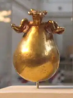 A different form of crotal is found in Prehistoric Ireland. The National Museum of Ireland and the British Museum have several examples on display dating from the late Bronze Age which were found in the Dowris Hoard, alongside various brass wind instruments. These are bronze cylinders in the rough shape of a teardrop, with a piece of baked clay or a pebble inside. It is presumed that they functioned as a type of rattle. The hoard had 48 of them in total, in two sizes. Only two other examples are known, both Irish.[2]