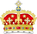 The circlet supports the four solid gold arches from the old crown, each of which is decorated with gold and red-enamelled oak leaves. The arches are topped by a gold monde, which is enamelled blue and covered with small gold stars, and topped by a gold cross pattée, set off with black enamel, eight pearls and a large amethyst. James V's royal cypher 'JR5' appears on the lower arm of the cross on top of the crown, enamelled in black.[4] The crown has a red velvet bonnet, with four enamelled gold ornaments adorned with a pearl attached to it between the four arches.[5]