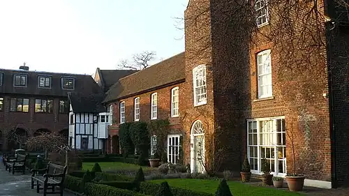 The Manor of Croydon was connected with the Archbishop of Canterbury from at least the late Saxon period,[2] and records of buildings date back to before 960.[3] The location of the original manor house is unknown. A larger palace was required to accommodate the retinues of the archbishop and his guests, and as a staging post between Canterbury and Lambeth Palace.[4] The palace as it now exists is a group of largely 15th- and 16th-century buildings, "an aggregate of buildings of different castes and ages", as Archbishop Herring found it in 1754.[5] Only the parts used by the archbishops remain: the servants' quarters, which made up the remaining three and a half sides of an irregular quadrangle, were demolished in the 19th century.[6]