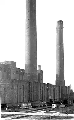 Planning for a Croydon B power station was begun in 1939, with the architecture designed by Robert Atkinson. However, these plans were delayed by World War II.[26] Immediately after the end of the war, construction work began on the new station. The station was built by Sir Robert McAlpine & Sons, who also used two locomotives during the construction work; the first was Hudswell Clarke No.82, used between 1946 and 1948, the second was Hudswell Clarke No.55, used for the remainder of 1948.[18] The station was finally opened in 1950.[26] Two 300 ft (91 m) chimneys had been built by 1949[27][28] and construction had begun on three cooling towers in 1948.[29] Work had started on the sixth in 1949.[27] Sewage water from the Beddington sewage farm was used to cool the steam,[30] as it had been done at Croydon A since the 1930s.[31] A white sludge built up in the condensers, which had to be manually removed once a month and descaled three or four times a year with acid. The sewage water was fed through a sand filter that reduced the particulates from 100ppm to less than 20ppm, but had little effect on the sludge. The white sludge was mainly calcium phosphate precipitating out in the cooling water. After much work and several years, it was discovered that this could be prevented by making the water more acidic. Chlorine was used because it was relatively cheap, didn’t cause other salts to be precipitated and killed biological microorganisms.