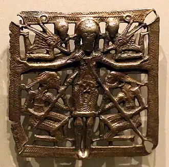 Crucifixion plaques are a type of Irish Early Medieval bronze sculpture consisting of a central panel of the still alive but crucified Jesus. He is surrounded by four ancillary panels showing Stephaton and Longinus (the lance and sponge bearers) in the lower quadrants and two hovering attendant angels in the upper quadrants. The borders or frames have cavities that once held nails or rivets, indicating that the plaques were intended as attachments to larger ecclesiastical objects, perhaps book shrines, processional crosses or altarpieces.[1]