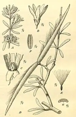 It is a shrub reaching 1.5 meters in height.[8] Its straight, slender, stems have pale grey bark. Its leaves occur in clusters. Its hairless, linear to slightly spatula-shaped leaves are 1.9–2.5 by 0.25–0.5 centimeters. The tips of its leaves are blunt or slightly pointed. The base of the leaves terminate in a rudimentary petiole. When the leaves fall, the petioles persist and form overlapping stacks. Its solitary flowers occur at the junction of the leaves and stem, and because the leaves are clustered can occur in groups of two or more. The flowers are on pedicels that are 0.8–1.9 centimeters long. The pedicels have slender hairless bracts midway up their length. The flower buds are twisted in a spiral. Its flowers have 5 lance-shaped sepals that are 2.5 millimeters long with pointed tips. The 5 petals are fused at their base to form a 2.5 millimeter-long, bell-shaped tube. The lance-shaped, hairless lobes of the petals are 7.6 millimeters long. The flowers have a ring-like structure between the petals and its stamen called a corona. Its corona have 5 thread-like, lobes that are 3.8–5.1 millimeters long and attached half-way up the petal tubes. Its stamen have tapering anthers that arch over the stigma. The styles of the pistils are shorter than the anthers and have cone-shaped tops.[6][9]