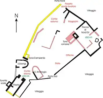 Behind the dungeon, the castle's plan opened in a fan-like manner, showing an angle of 15°; the whole area was a plain court, hosting two buildings: in the western part of the yard there was the church of Saint Denis, the French patron of Paris; on the opposite side another church, dedicated to Saint Ambrose could be probably found, whose ruins cannot be clearly identified.