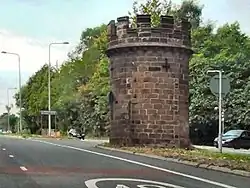 The early history of Cuddington and Sandiway is also closely associated with Vale Royal Abbey, at nearby Whitegate, once the largest Cistercian abbey church in Britain. Sandiway's most famous building is the "Round Tower Lodge" which was built in the early 19th century as the gatehouse to Vale Royal Abbey. The 18-foot high tower is said to have a concealed dungeon which was used as a hiding place by King Charles II. At that time it stood on a quiet country lane but the road became increasingly important and the tower is now a unique landmark in the central reservation of the A556. Now a listed building with a castellated top and bricked up gothic windows, it was a residence until the 1920s and had a single story extension to its east wall which has since been removed.