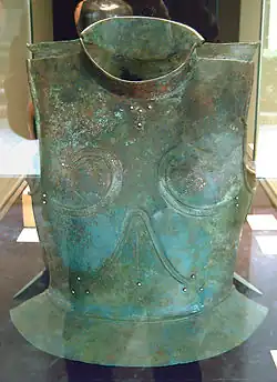 In Hellenistic and Roman times, the musculature of the male torso was idealized in the form of the muscle cuirass[2] or "heroic cuirass" (in French the cuirasse esthétique)[3] sometimes further embellished with symbolic representation in relief, familiar in the Augustus of Prima Porta and other heroic representations in official Roman sculpture. As parts of the actual military equipment of classical antiquity, cuirasses and corsets of bronze, iron, or some other rigid substance were used. Secondary protection for the breast was worn in earlier times by men-at-arms in addition to mail hauberks and reinforced coats. It was not until the 14th century that the plate armour became an established part of medieval armour.[4]