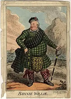 Curtis was known for his lavish banquets at which King George IV was sometimes a guest.[1][6] Curtis and George visited Scotland together wearing kilts, although both were born in London, which provided material for the cartoonists of the day.[3] Described by the authors of The History of Parliament as "a portly and bottlenosed bon vivant",[7] Curtis was said to be very proud of his wine cellar and his kitchens which featured a gallery so that guests could see their dinner being prepared.[6]