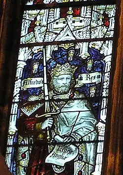 In the 16th century Alfred became the ideal symbolic champion for the rising English Protestant church during the English Reformation. Alfred had encouraged the use of English rather than Latin in education, and his translations were viewed as untainted by later Roman Catholic influences. Archbishop Matthew Parker published an edition of Asser's Life of Alfred in 1574. It was at this time, over 600 years after his death, that Alfred was first given the epithet "the Great". The designation was maintained by those who admired Alfred's perceived patriotism, his undoubted success against barbarism, promotion of education, and establishment of the rule of law. The comparatively greater amount of written information from his reign, including his law code and Asser's account of Alfred's thoughts on law, education and administration helped. The historical Alfred evolved into the increasingly popular legendary Alfred. He was venerated as a Christian hero, with a feast day or commemoration on 26 October, and he is often found depicted in stained glass in Church of England parish churches.[4] He became the ideal unthreatening example of a ruler when discussing the ideal monarch and the roles of monarchy in a modern state; and 18th century British royals like Frederick, Prince of Wales could draw upon Alfred's popularity in creating their own royal images. The cult of King Alfred the Great increased until by the reign of Victoria, Alfred was perceived as founder of the English nation and an archetypal symbol of the nation's perception of itself. He has been seen as a heroic figure, who centuries after his death inspired many artistic and cultural works. During this period, "Alfred" became a popular Christian name, with Queen Victoria in 1844 naming her second son Prince Alfred. In 1870, Edward Augustus Freeman called Alfred the Great "the most perfect character in history".[5] "Alfredophilia" and "Alfredomania" found expression in religious, legal, political and historical writing; in poetry, drama, music and prose; and in sculpture, painting, engraving and book illustration.[6] In 2002 Alfred was still ranked number 14 in the BBC's poll of the 100 Greatest Britons.[1][7][8]