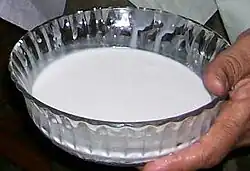 Coconut and curry leaves are common ingredients to most curries.[6] Sanna-Dukra Maas (Sanna – idli fluffed with toddy or yeast; Dukra Maas – Pork) is one of the most popular dish of the Mangalorean Catholic community.[7] Rosachi Kadi (Ros Curry), a fish curry made with coconut milk (ros), is a traditional curry served during the Ros ceremony.[8] Patrode, a dish of colocasia leaves stuffed with rice, dal, jaggery, coconut, and spices is also popular.[9] Kuswar are sweet delicacies prepared during Christmas and includes around 22 varieties of sweets.[10] Fish and rice form the staple diet of most Mangalorean Catholics.[11] Par-boiled rice, also known as red rice, is the traditional rice eaten[12] and preferred over raw rice.[11]
