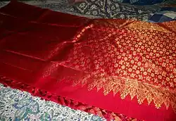 The Mangalorean Catholic bride's sari is known as a sado.[50] It is usually a red coloured Benaresi sari, which are made of finely woven silk and are decorated with elaborate engravings.[42] The bride is also presented with another sari by her own people which is called dharma sado, which was worn on other festive occasions. Some brides also wear a white sari during the nuptial blessing in church. Ornaments worn by the bride in ancient times included kanti, chakrasar, kap, karap, mugud, kanto, and dantoni.[48] Except datoni none of these ornaments are in use in the modern generation.[48] Present-day brides wear a few gold ornaments, some rings on the fingers, earrings and at least two of the golden combs known as dantoni that consisted of two ordinary combs and the upper part of each one was plate with gold, that are worn in the hair on both sides of the headover the ears. On the way to church she wears some white and red flowers stuck in the hair. In the centre of the forehead, a bang (gold chain) was placed with a pendant.[51] A widow had to wear a black sari all her life, and was not allowed to wear ornaments.[32]