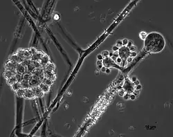 Cunninghamella echinulata is a member of the family, Cunninghamellaceae (phylum Mucoromycota).[1][8] This species is closely related to C. elegans, and both species share highly similar characteristics of growth and morphology. Colonies tend to be rapidly growing on most growth media producing a dense, white or greyish aerial mycelium.[9] Cunninghamella echinulata reproduces asexually and solely via yellow-brown, spiny, single-spored sporangioles that, due to the nature of the sporangiospore being retained within the sporangium, appear to have a two-layered outer wall.[1][10][11] This fungus grows by means of filaments that lack septa.[6][12] This is a common feature of members if the Mucoromycota where the hyphal compartments are either fully divided by septa or are completely continuous (coenocytic) and multinucleate. Zygospores of this fungus are only produced following the fusion of gametangia of compatible mating strains, exemplifying a heterothallic mating system.[13] Sporangiophores of this species are irregularly branched and do not resemble the sporangiospores typical of most other members of the Mucoromycota encountered in similar habitats.[13][9] The sporangioles produced by this fungus are larger in size (10–20 μm) than those of the closely related species, C. elegans.[13]