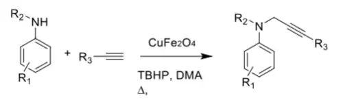 Another example for MCR utilizing CuFe2O4 was published in a research towards the A3 coupling of aldehydes, amine with phenylacetylene to give the corresponding propargylamines. The catalyst can be reused three times without remarkable reduce in reaction yield.[22]