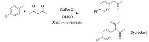 - ^ a b c d Nguyen, Anh T.; Nguyen, Lan T. M.; Nguyen, Chung K.; Truong, Thanh; Phan, Nam T. S. (2014). "Superparamagnetic Copper Ferrite Nanoparticles as an Efficient Heterogeneous Catalyst for the α-Arylation of 1,3-Diketones with C–C Cleavage". ChemCatChem. 6 (3): 815–823. doi:10.1002/cctc.201300708. S2CID 97619313.