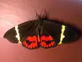 Upperside: Antennae filiform and black. Thorax and abdomen chocolate, the latter edged with red. Anterior wings entirely of a dun chocolate colour, having a lemon-coloured streak crossing them from the lower corners to near the middle of the anterior edges. Posterior wings next the body almost black; the remainder carmine, with a waved black line crossing them from the upper to the abdominal corners.[2]