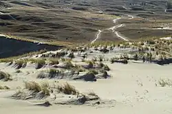 The Curonian Spit is home to the highest moving (drifting) sand dunes in Europe. Their average height is 35 metres (115 ft), but some attain a height of 60 metres (200 ft). Several ecological communities are present on and near the Spit, from its outer beaches to dune ridges, wetlands, meadows, and forests.[7] Its location on the East Atlantic Flyway means it is frequently visited by migratory waterfowl. Between 10 and 20 million birds fly over the feature during spring and autumn migrations, and many pause to rest or breed there.[7]