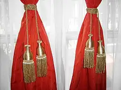 Almost a variety of tassel tie-back, the pendulum tie-back consists of one or two large handing decorative pendulums attached to ropes which loop around the curtain.