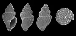 (Original description) The shell is small, sub-fusiform, too short ovate. It contains about five or six turreted, flattened whorls, which are angularly shouldered just below the suture. The subsutural band arises abruptly from the suture, nearly at right angles, and its surface is flat or slightly concave, marked by strongly recurved lines of growth, but mostly without spiral lines. The shoulder is often nearly right-angled. The whorls are decidedly flattened in the middle. There are on the body whorl, about twenty rather broad, flattened or rounded ribs, which are nearly straight, a little prominent and usually slightly nodose at the shoulder, but they disappear a short distance below it. They are separated by well excavated, concave grooves, deepest close to the shoulder. The most characteristic feature of the sculpture is that the surface is marked by rather fine, but regular and distinct, sharply incised, narrow, revolving grooves, which are rather distant, with flat intervals. Of these, there are usually about three to five on the penultimate whorl, and about twenty to twenty-eight on the body whorl, the greater number being below the middle, on the siphon, where they become coarser and closer, with narrower rounded intervals. One of the sulci, just below the shoulder, is usually more distinct, and cuts the ribs so as to give their upper ends a subnodulous appearance. Below this there is usually a rather wide zone, without grooves usually no revolving lines above the shoulder. The apex is usually eroded. When perfect it is acute. The protoconch has a very small and slightly prominent smooth apex. Its first whorl is marked with fine spiral lines. The next whorl has, at first, about three stronger, spiral, raised cinguli, which soon begin to be crossed by thin transverse riblets. The aperture measures about half the length of the shell. It is narrow ovate, or elliptical, angulated above. The siphonal canal is short, nearly straight, and a little narrowed at the base by an incurvature of the lip. The outer lip has a decided angle at the shoulder, below which the edge is well-rounded, and projects strongly forward, in the middle. The sinus, above the shoulder, is rather deep, wide, and evenly rounded within. The columella is strongly excavated in the middle, obliquely receding at the end. The shell is commonly greenish white and covered by a thin, close, greenish epidermis ; but some specimens are clear white, and rarely pinkish.[2]