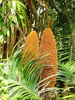 Cycas media is a palm-like cone-bearing plant widespread in seasonally dry tropical sclerophyll woodlands close to the east coast of Queensland, with scattered occurrences also in northern Northern Territory and Western Australia, Australia.[2][3] The dark green leathery, thick leaves are pinnately divided and grow in annual flushes from a massive apical bud. It is tolerant of bushfire and often re-foliates immediately following a dry season fire, before the beginning of the next rainy season. All plant parts are considered highly toxic. However, the seeds were eaten by Aboriginal Australians after careful and extensive preparation to remove the toxins.