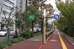 In Japan, cycling infrastructure is generally shared with other infrastructure (94%) and generally not marked.[2] There is almost no extensive system of separate cycling facilities with well-maintained discriminated paths, lanes and special bicycle streets.[3] Exclusive bicycle roadway accounts for only 1,978 km (1,229 mi) or 2% of all roadway.[2]