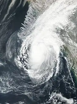 As Ockhi moved further into the Arabian Sea, it traveled through an area of sea surface temperatures of 31 °C (89 °F) and decreasing wind shear; a 23 mi (37 km) eye became visible on satellite imagery, prompting the JTWC to upgrade it to a Category 3-equivalent cyclone early on December 2.[18] On December 4, analysis showed that Ockhi was maintaining a source aloft, but there was restricted outflow on the western edge, due to a deepening trough advancing rapidly from the west.[19] Increasing vertical wind shear along with a deep layered subtropical ridge to the east steered it north-northeast, and a dry air intrusion from the west gradually weakened the system.[20] On the following day, the power of the storm quickly lessened as it encountered increasingly unfavorable conditions, including high wind shear.[21] Dry and cold air from the northern parts of India rapidly weakened the storm, and it was last noted as a well-marked low-pressure area south of the Gulf of Cambay on December 6.[22] Afterward, the remnant of Ockhi crossed over land and dissipated several hours later.[5] During its lifetime as a tropical cyclone, Ockhi traveled a distance of 2,538 km.[2]