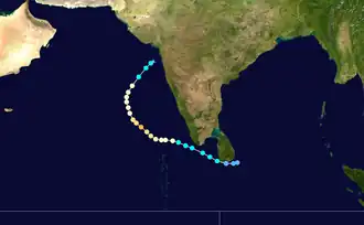On November 28, an area of low pressure from the remnant energy of Tropical Storm Kirogi developed about 425 km (265 mi) to the south-southeast of Colombo, Sri Lanka.[9][2][10] The disturbance was located within an area of warm sea surface temperatures and moderate to strong vertical wind shear, with atmospheric convection scattered around the disturbance's ill-defined low-level circulation center.[10] On November 29, the storm organized into a depression just off the southeastern coast of Sri Lanka, and the India Meteorological Department (IMD) gave the system the identifier BOB 07.[11] Due to the storm's rapidly consolidating low level circulation center, the Joint Typhoon Warning Center issued a Tropical Cyclone Formation Alert, shortly before classifying it as Tropical Cyclone 03B on November 29.[12] The IMD followed suit, upgrading the storm to a Deep Depression, and soon afterwards to Cyclonic Storm Ockhi.[13] The storm tracked along Sri Lanka's southwestern and western coastline, towards the west-northwest, around the southern verge of a subtropical ridge located over India.[14] Owing to highly favorable conditions, the storm displayed a thick convective ring, surrounding a well-defined eye feature on the same day.[15] The storm tracked westwards and intensified further into a Severe Cyclone Storm early on December 1.[16] Soon afterwards, Ockhi intensified further into a Very Severe Cyclonic Storm.[17]