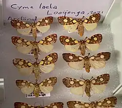 Cyme laeta is a moth of the subfamily Arctiinae first described in 2021 by the then 18-year-old Noortje Looijenga during her internship at the Naturalis Biodiversity Center in the Netherlands.[1] It is found in New Guinea.[2] Laeta is Latin for happy, surprise, colorful and rich in contrast. Looijenga explained that: "Of course, this refers to my joy upon discovering this new species. Moreover, Cyme laeta is slightly more strongly colored than their sister species Cyme reticulata."[3] The type specimen had been caught by Rob de Vos, her internship supervisor, during a work trip.[1] The determination that this was a different species was made by Looijenga by examining the sex organs under a microscope.[1]