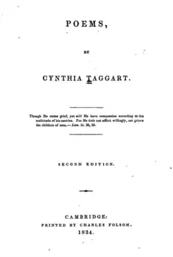 Cynthia Taggart (1801/04–1849) was a 19th-century American poet. A chronic invalid, she lived with unceasing pain, from her early infancy, during the period of her adolescence, and through the duration of her life.[1] Physical anguish was a repetitive theme in Taggart's poems.[2] She died in 1849.